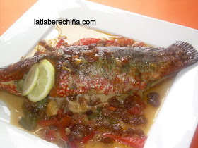 5. En una bandeja  de horno colocar el sofrito. Poner el pescado encima y asar unos 30 minutos. Que el pescado este en el punto de cocción  que os guste. Bañarlo con frecuencia con  la salsa.